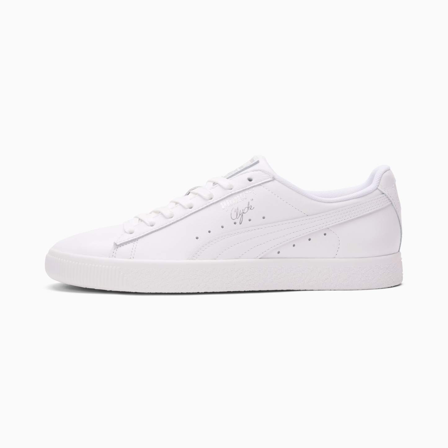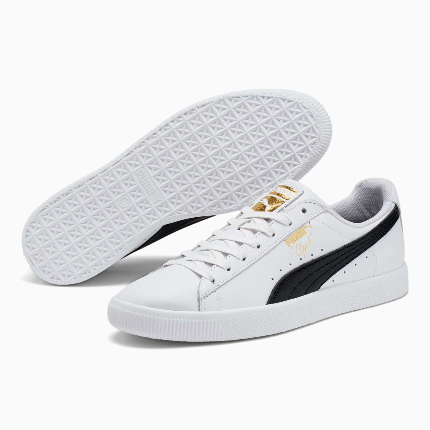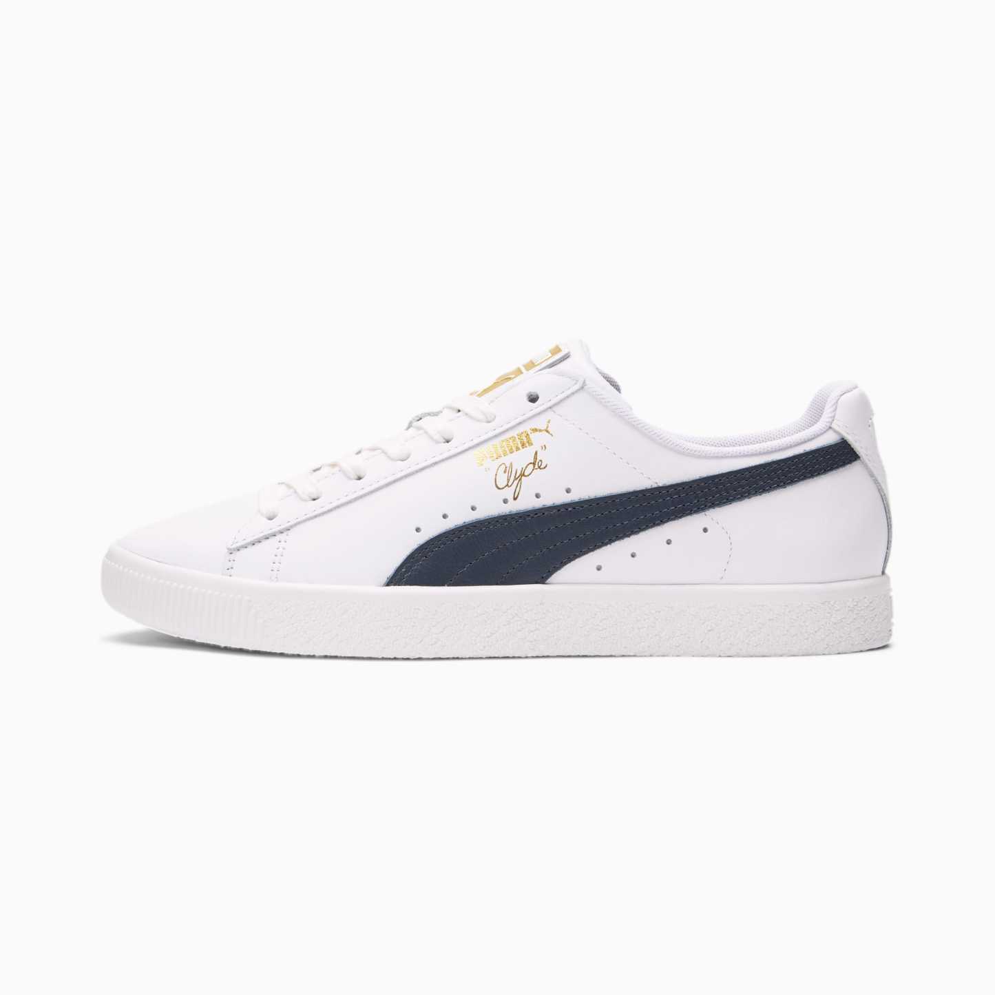 Pay tribute to a legend in this gold edition Clyde. Inspired by the legend himself, we created the pumthta Clyde back in 1973 just for basketball icon Walt "Clyde Frazier". Known for his on-court playstyle and off-court street style, the Clyde is all class and flash. This version is updated with gold foil branding and a premium leather upper.